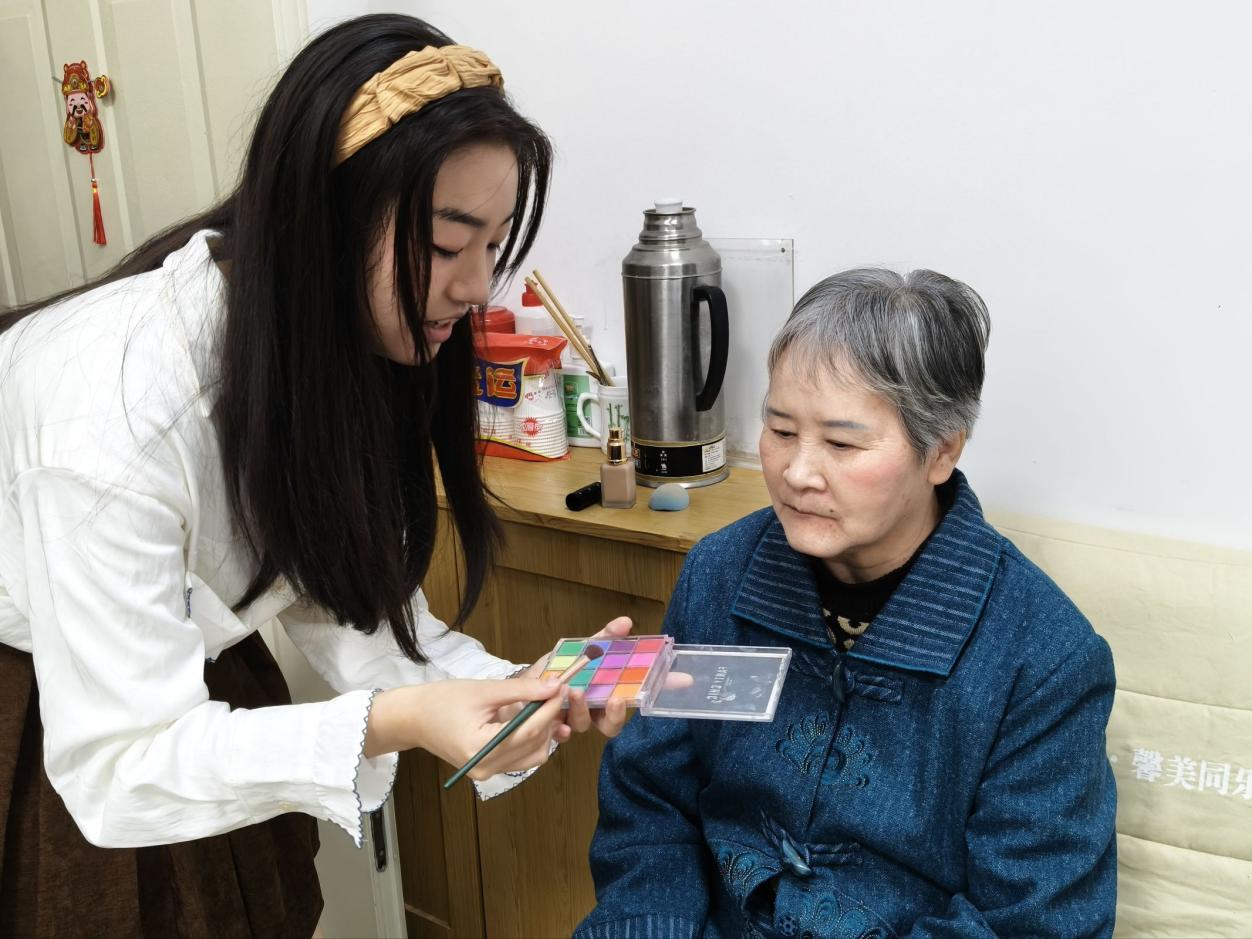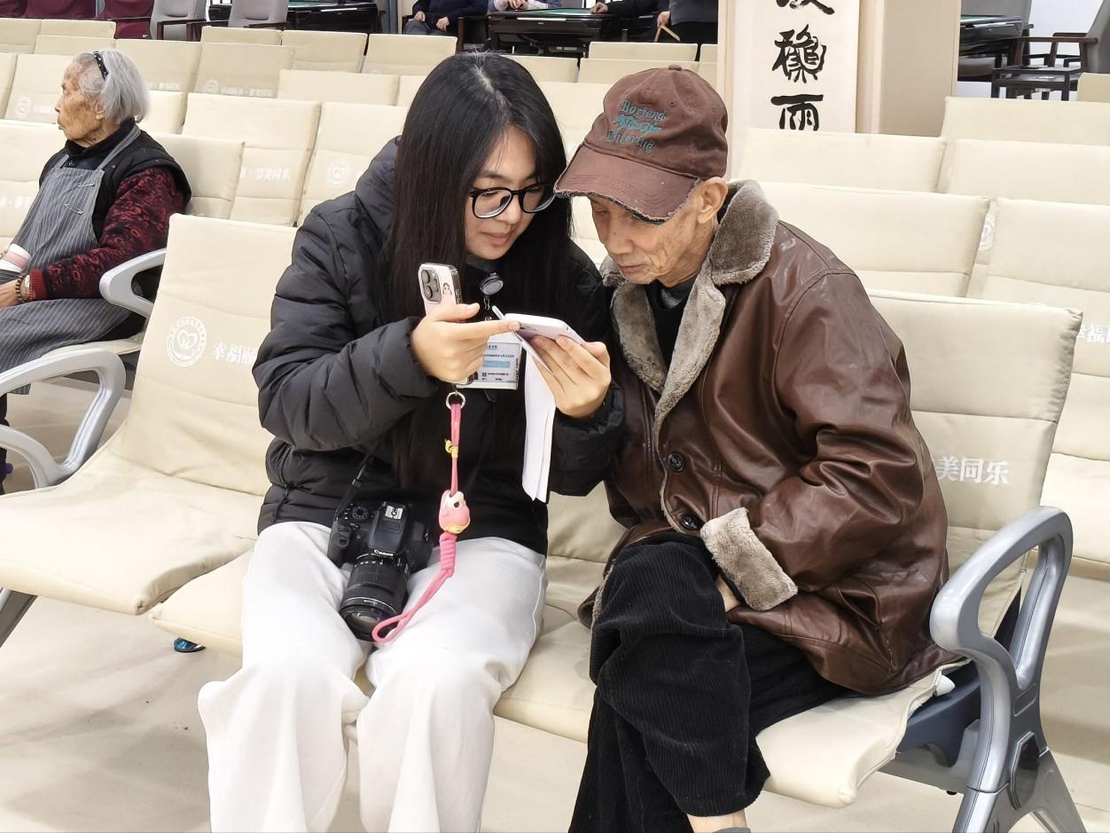 活动以传统习俗互动与文艺表演结合的形式,为老人们送上节日祝福。党支部学生于佳、王皓然、刘执政、韦彦伶、王盈盈、游梦灵表演诗朗诵《这盛世如你所愿》,该节目结合“前辈奋斗”主题,深情回顾了前辈们的奋斗历程,引发了老人们的强烈情感共鸣,不少老人眼含泪光,感慨万分。随后,支部学生为老人演唱了歌曲《紫荆花盛开》,节奏舒缓,旋律优美,并邀请老人们轻轻跟唱,现场气氛温馨而融洽。此外,敬老院老年合唱团也带来了节目《亲爱的朋友们今天来相会》,将现场气氛推向了高潮。期间,学生为老人化妆时,老人们互相欣赏妆容,脸上洋溢着开心的笑容,李奶奶拉着学生的手说:“这胭脂涂得比过年还喜庆!”在教老人使用电子设备环节,张爷爷在学会视频通话后,立即拨通了在外工作的儿子的视频电话,现场分享这份跨越千里的温情。