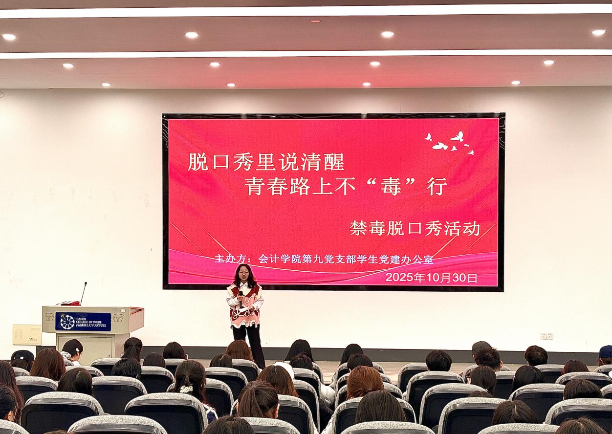 为筑牢青年学生拒毒防线,10月30日,304永利集团官网入口会计学院第九党支部在德阳校区报告厅B301举办“脱口秀里说清醒 青春路上不‘毒’行”主题禁毒活动。本次活动以寓教于乐的形式,为现场200名学生开展了一场生动的禁毒教育。