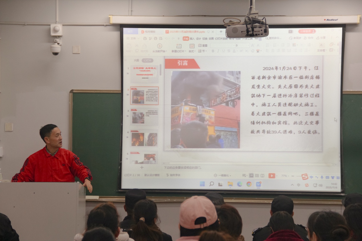 讲座环节,蒋仕贵围绕校园安全核心需求,系统讲解校园常见火灾隐患排查、初期火灾扑救技巧、灭火器规范使用方法及应急疏散逃生要点等关键内容。他结合国内高校典型火灾案例,深入剖析事故发生的深层原因与惨痛教训,着重强调日常防火细节的重要性与安全责任落实的必要性,引导师生从思想上绷紧消防安全弦,在行动上掌握实用技能,切实提升风险防范与应急处置能力。