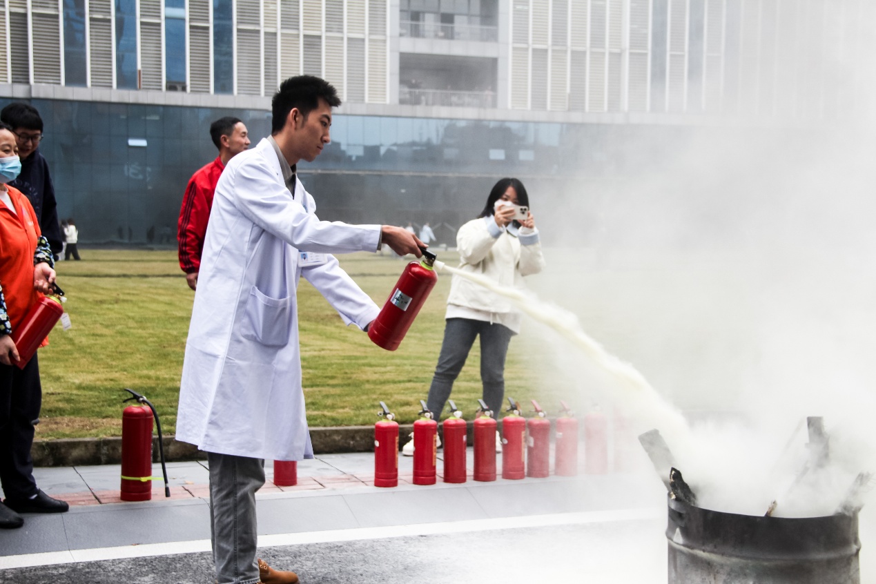 讲座结束后,消防实战演练正式启动。演练前,后勤保卫部工作人员再次细化讲解消防安全知识与应急处置流程,明确疏散路线与注意事项;演练中,火警警报信号响起,全体人员迅速响应、弯腰低姿、捂住口鼻,按照预定路线快速有序疏散至安全区域。随后,在专业人员指导下,参与人员分组规范操作灭火器扑灭模拟火源,将理论知识转化为实战能力,整场演练紧张有序、成效显著。