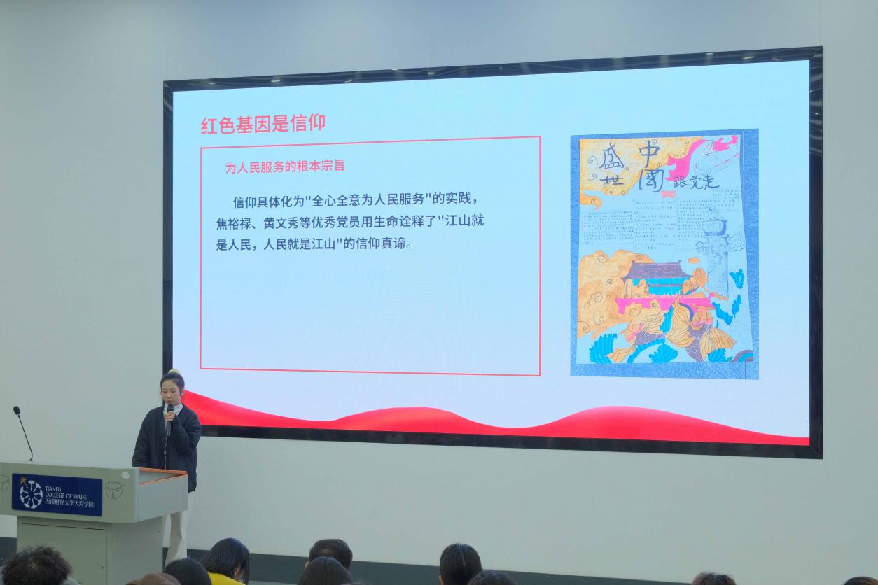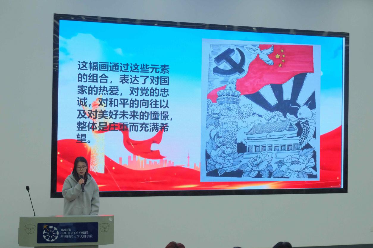 决赛现场,参赛选手依次登台,结合精心制作的视频或海报,以声画交织的演示方式,将百年党史的峥嵘岁月娓娓道来。有的选手播放视频,以电视剧《觉醒年代》为引,带领全场重温党的历史上的多个经典片段;有的选手则以手绘海报为媒介,或勾勒出南湖红船启航的壮阔图景,或用拼贴手法叠映出改革开放以来的沧桑巨变。