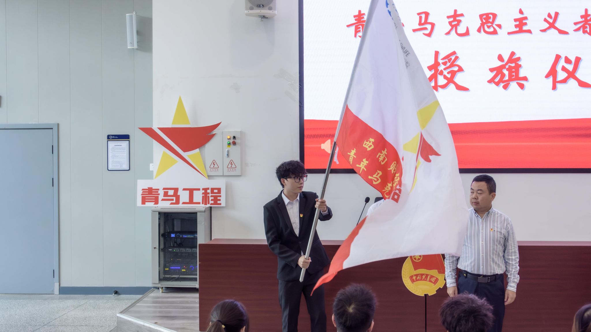 随后,举行了庄重的授旗仪式。上期优秀学员代表李文志进行旗帜交接,蔡松伯为本期学员代表何俪愿授予青年马克思主义者培养工程旗帜。此举不仅是荣誉的传承,更是责任与使命的接力。授旗仪式结束后,主持人邀请陈杰带领全体学员庄严宣誓,铿锵有力的誓言响彻全场,彰显了学员们深入钻研马克思主义理论学习、积极投身实践锻炼的坚定信念与昂扬风貌。