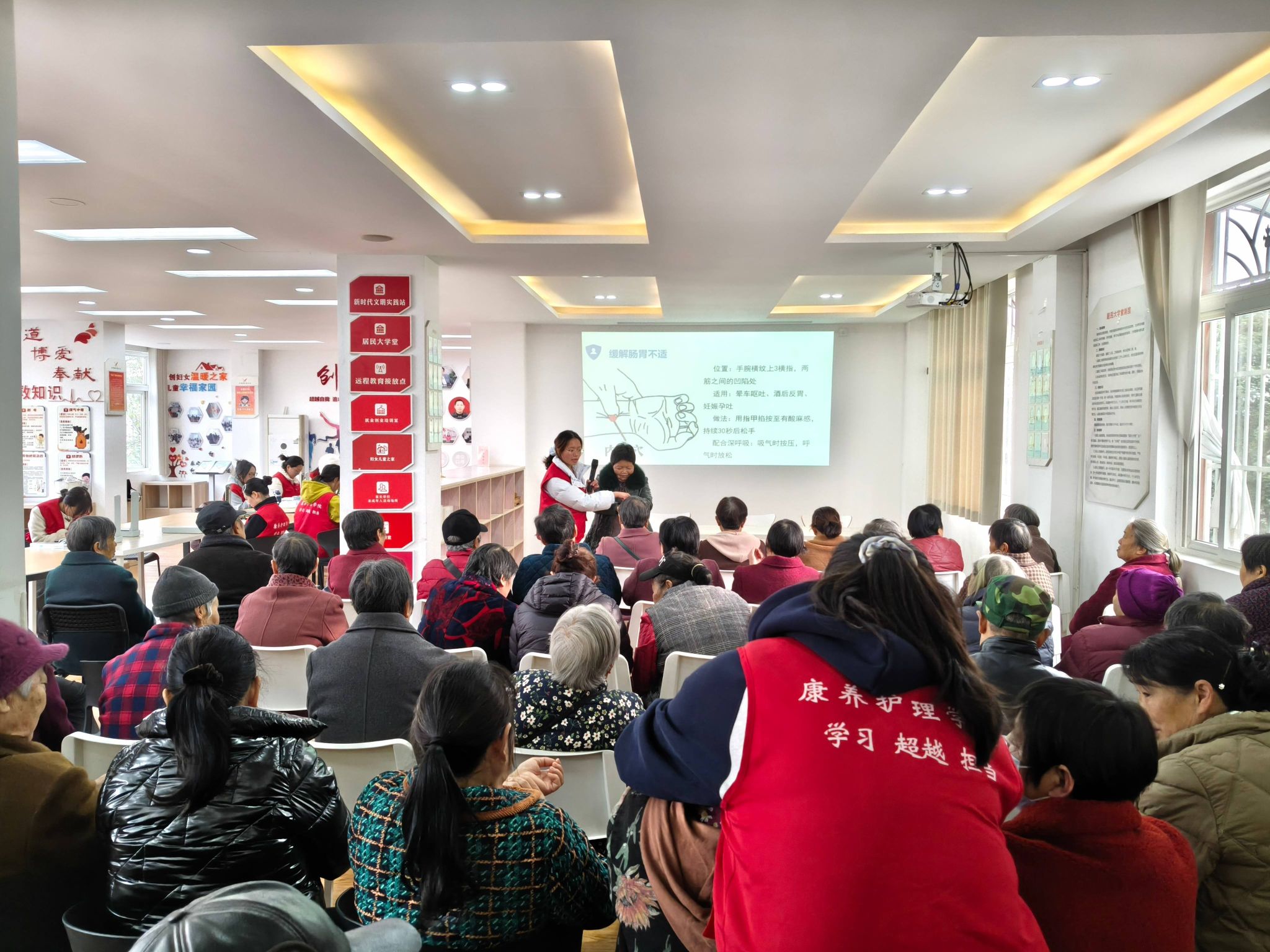 在肠胃健康环节,周雅丽结合冬季常见肠胃问题,讲解了腹泻、腹胀、腹痛等症状的成因与应对方式,分享了多甘少酸、忌贪凉、规律三餐等饮食原则,并现场带领居民共同学习了按摩内关穴、足三里、合谷穴、中脘穴等穴位,以缓解肠胃不适。居民们跟随讲解认真练习,在互动中掌握了实用的肠胃养护方法。