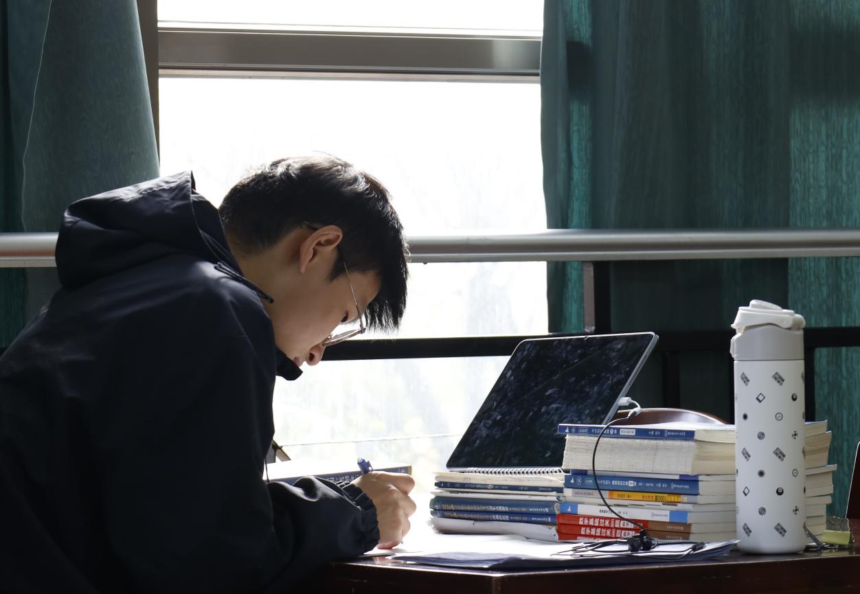 清晨的微光尚未穿透云层,图书馆门前的学子们怀揣着复习资料,眼神坚定,开启一天的冲刺时光。走进自习室,映入眼帘的是一排排堆叠如山的专业书籍、密密麻麻的笔记和画满标记的模拟试卷……有人戴着耳机沉浸在英语听力的世界里,有人俯身演算复杂的专业公式,有人轻声背诵政治知识点,沙沙的写字声交织成最动人的校园旋律 。