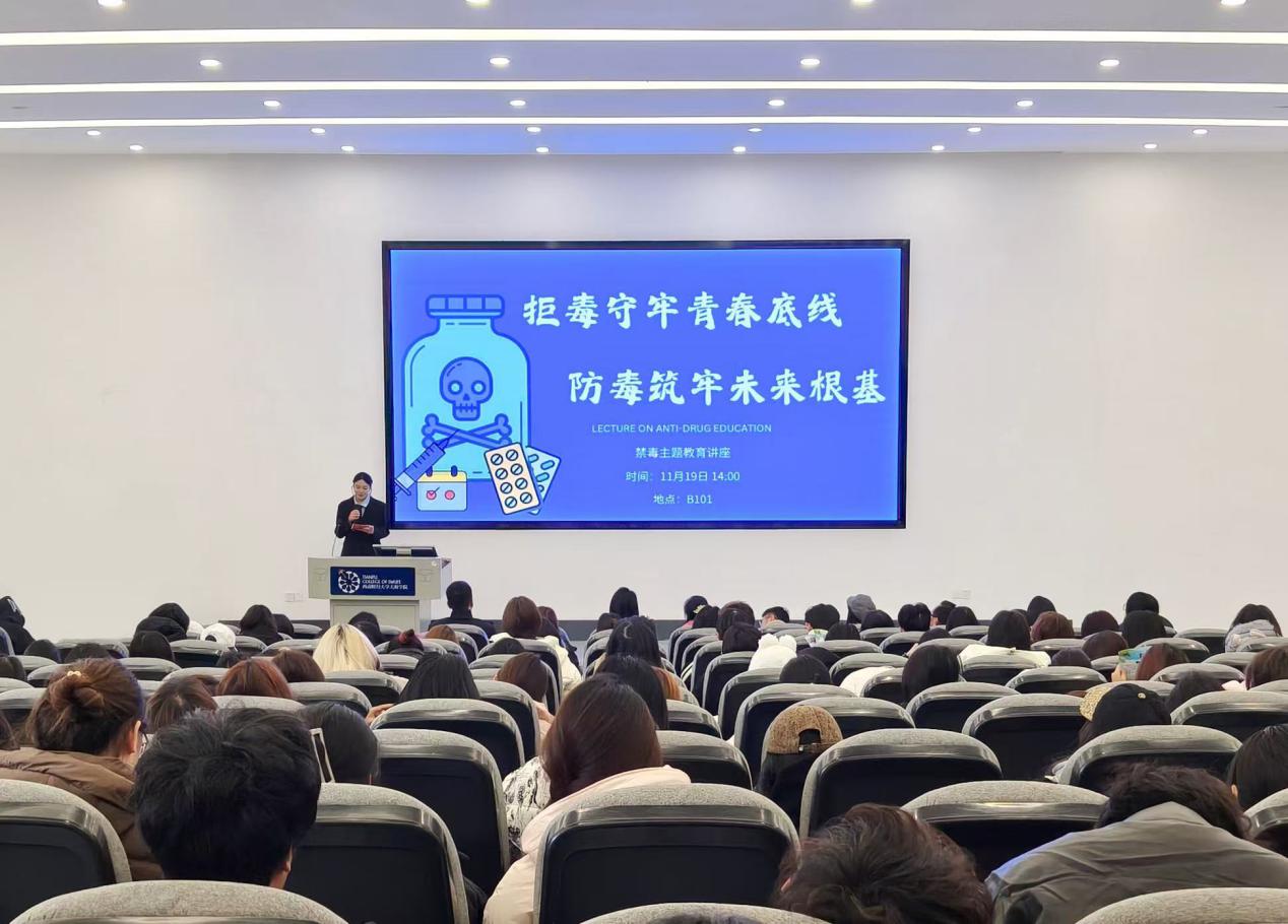 讲座伊始,主持人屈思言首先向在场师生阐述了本次活动的重要意义。她提到,“全民禁毒、预防为先”是当前国家禁毒工作的核心方针,青少年禁毒预防教育更是筑牢禁毒防线的关键环节。毒品这一“隐形毒瘤”正以极具迷惑性的伪装,严重侵蚀青少年的身心健康,破坏社会的和谐稳定。开展禁毒主题教育,正是守护青春航向、筑牢人生根基的关键一环。随后,主持人代表全体师生,向奋斗在禁毒一线的谭淞鹏警官致以热烈欢迎。