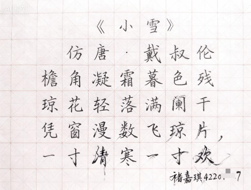 活动筹备阶段,各班青协委员在班级群定向推送活动海报与详情文案,清晰解读活动主题、参与方式及作品要求,让“以笔为媒,共赴小雪之约”的理念深入人心,成功吸引了同学们的踊跃响应。为呈现高质量作品,有的同学会提前深耕小雪节气文化:或上网搜集文献,探寻“十月中,雨下而为寒气所薄,故凝而为雪”的节气本源;或品读经典诗词,揣摩“檐飞数片雪,瓶插一枝梅”的清欢意境;或搜集民间谚语,体悟“小雪封地,大雪封河”的生活智慧。大家纷纷备齐笔墨纸砚,铺展素笺;部分同学则巧用电子书写工具,调试笔触效果,在反复推敲中酝酿创作灵感,只为将对小雪的理解与热爱凝于笔端。