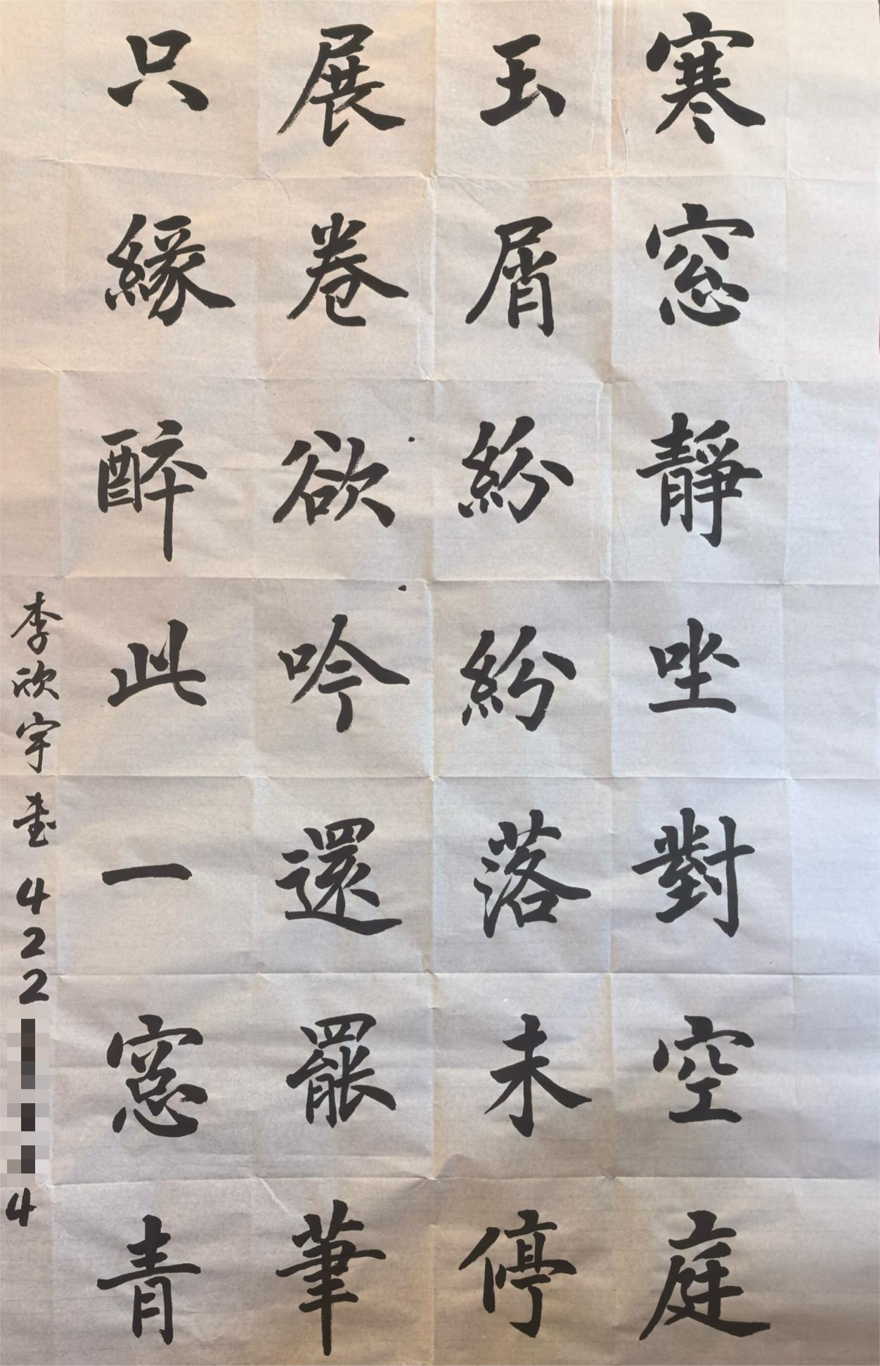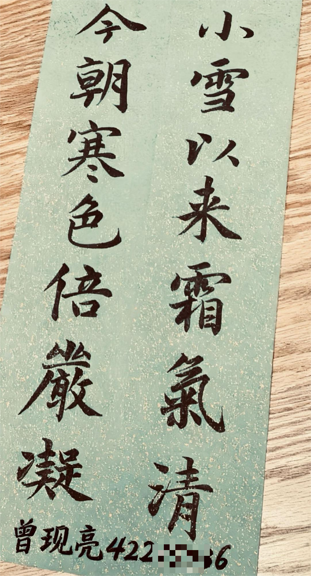 活动开展期间,同学们以笔为桥,与节气对话,一幅幅饱含才情的书法作品陆续涌现。楷书落笔沉稳、结构端庄,一笔一划间尽显“莫怪虹无影,如今小雪时”的哲思韵味;行书笔墨流转、洒脱飘逸,在挥毫泼墨中勾勒“晚来天欲雪,能饮一杯无”的雅致意境;隶书蚕头燕尾、古朴厚重,顿挫转折间镌刻民俗文化的深厚底蕴。更有不少同学跳出传统框架,以短句抒怀:“凝霜染枝丫,墨香暖流年”“小雪藏冬意,笔端见初心”,字字句句皆凝聚着对冬日的热爱与对生活的感悟。