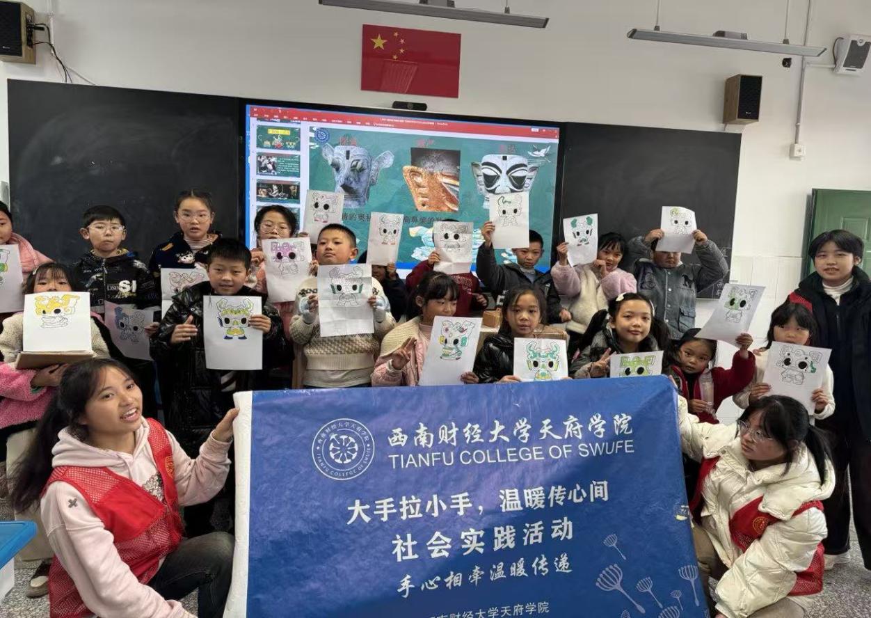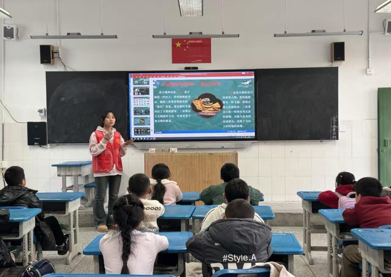 触摸古蜀文明脉,守护非遗少年责。本次活动以“大手拉小手,温暖传心间”探秘三星堆为主题展开,由阳淋沥、罗宇婷、吴秋悦组成的志愿团队,带领鄢家小学的孩子们开启了一场满含好奇与探索的探秘三星堆活动,让孩子们在趣味互动中感受古蜀文明的深邃魅力。