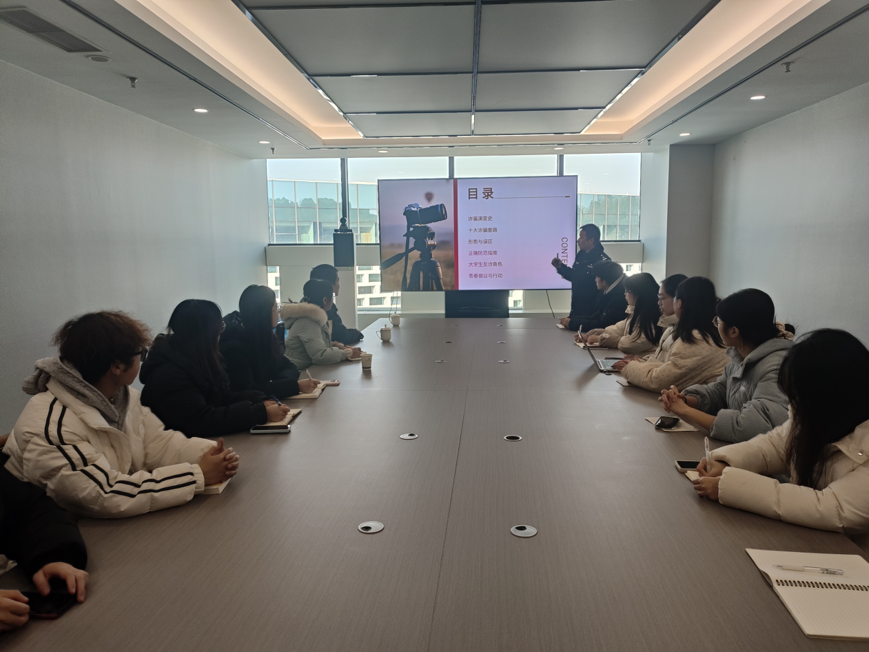 本次培训特邀四川省德阳市罗江区万安派出所分管社区副所长张浩、中队长杜建担任主讲嘉宾。培训内容紧密结合当前电信网络诈骗高发态势,重点围绕大学生群体易受骗类型进行了系统讲解。培训中,主讲嘉宾结合罗江区大学城周边近期发生的真实案例,深入剖析了刷单返利、冒充客服、虚假购物、校园贷、“杀猪盘”等常见诈骗手法。他们强调,诈骗分子往往精准把握大学生社会经验不足、求职心切及网络社交活跃等特点,精心设计骗局,极具迷惑性与针对性。因此,开展持续、多元的宣传教育活动,对于在校园内构筑一道坚实的“防诈堤坝”来帮助学生擦亮双眼、远离诈骗具有重要意义。