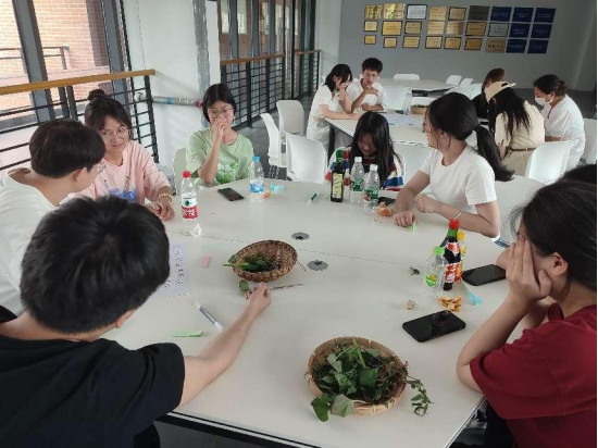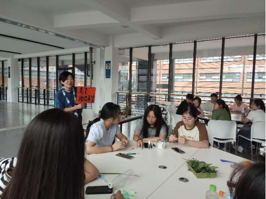 为了引导学生更好地理解和参与,讲座开始前两位专家对讲座现场提前进行了布置。讲座于下午两点准时开始。首先,刘雪艳带同学们通过观察、触摸、品嗅等感受了不同香草的味道,并引导学生分享记录自己的感知。随后温地根据大家的分享结果进行归纳,同时引导同学们与身边的伙伴分享自己的所思所想。