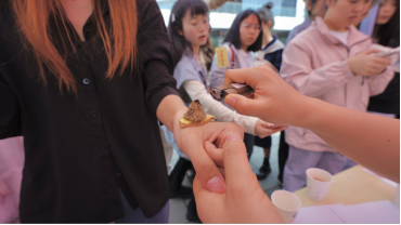 制作香囊环节,现场热闹非凡。工作人员准备了各种香囊制作材料,展示了详细的制作教程,并生动地讲解了各种药材的功效。工作人员化身“知识小达人”,与同学们进行互动,邀请大家回答关于中医药文化的小问题,既考验了同学们的文化素养,又加深了对中药功效与用途的了解。同学们热情高涨,一起探讨制作技巧,制作出别具一格、形态各异的香囊。