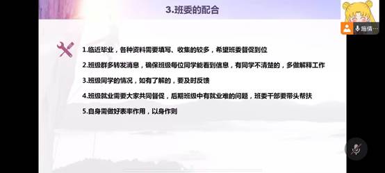 班会上,辅导员老师就各班上学期课堂考勤、学习情况及班级管理进行总结,通过向同学们开展思想政治教育和价值引领,推动党的二十大精神入心入脑,鼓励同学们推进“党-团-班”一体化建设。并对同学们反馈的生活困难、心理困惑等给予积极回应。班会中,学院各辅导员老师立足本年级当前情况对班级学生做有针对性的指导,2019级辅导员马岚就同学们提出的就业和实习相关问题进行解答,帮助同学们更好地进行实习就业;2020级辅导员刘幸着重帮助同学们理清思路,为下一步的规划目标做好充分准备;2021级辅导员苟明娇引导学生在“疫情后”重构学生组织新形态,回归学习,鼓励大家要向老师和同学虚心请教;2022级辅导员虞飞引导学生进行学业规划,希望同学们积极参加课外活动,考取相关证书,朝着自己的目标不断迈进。