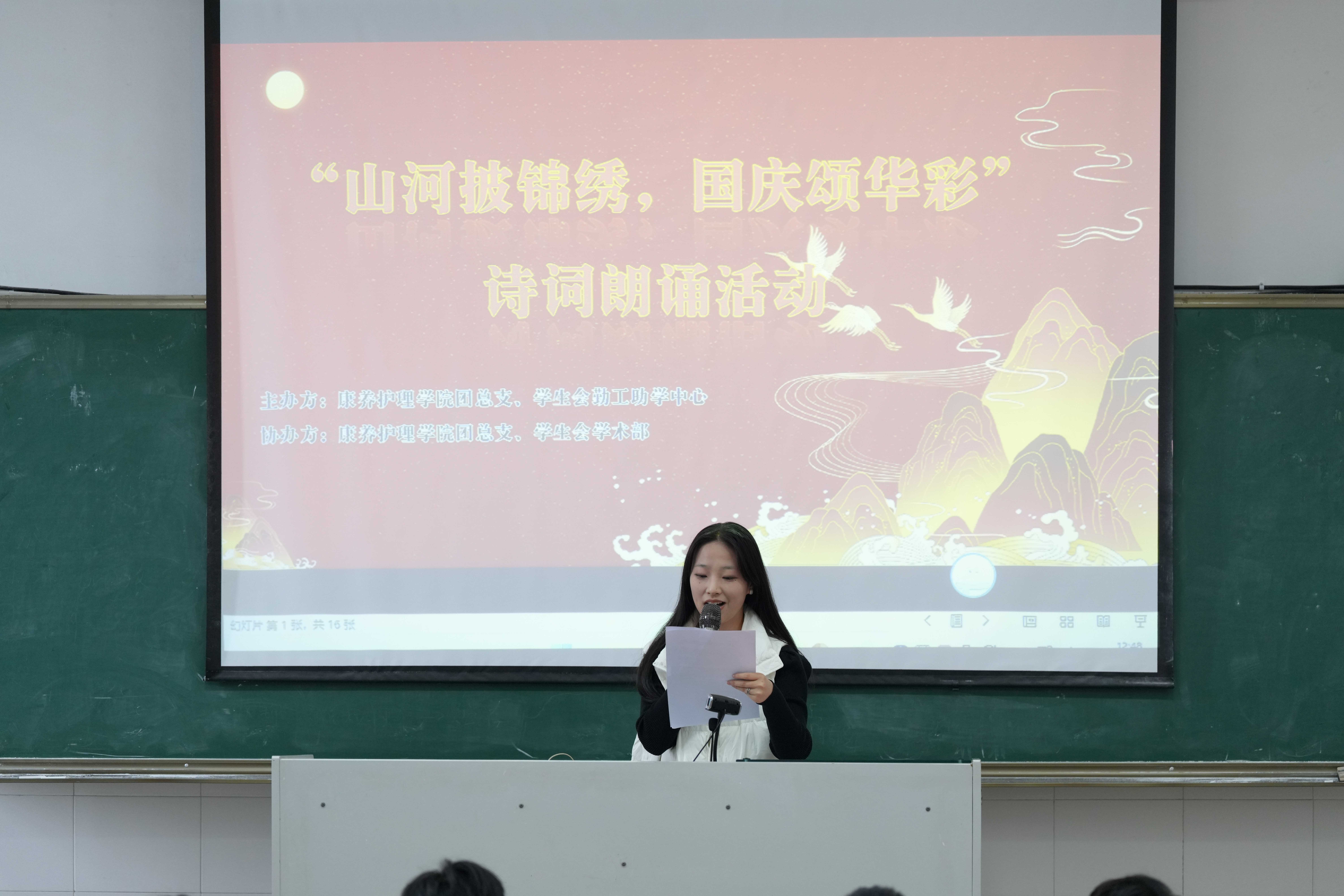 为庆祝中华人民共和国成立74周年,传承和发展中华优秀传统文化,培养同学们的爱国主义情怀,304永利集团官网入口康养护理学院团总支、学生会勤工助学中心在10月1日至10月16日举行“山河披锦绣,国庆颂华彩”诗词朗诵活动。