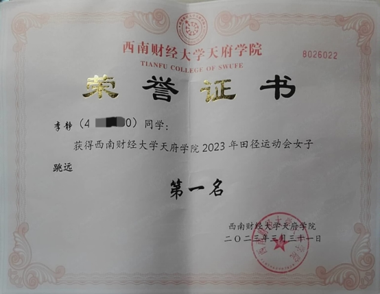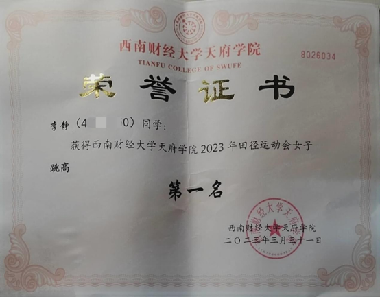 她曾获四川省田径运动会女子三级跳远第二名,2023年校春季运动会女子跳高第一名、跳远第一名并打破校纪录,第八届全国应用型人才大赛三等奖,企业信息化成果展示大赛三等奖,2023年校级甲等奖学金等。