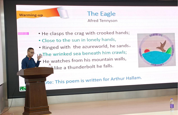 讲座开始,舒洪成说到,“翻译就是理解和使人理解”,他首先展示了英文诗——The Eagle(鹰)让同学们试译,接着他用通俗易懂的语言,让同学们能更清楚地明白翻译不仅是简单地理解单个词语意思,更重要的是理解源语的蕴含语义和言说方式。在讲翻译生成机制与交际价值时,他给大家呈现了一个鲜活的例子:“A:你们家今年炸圆子吗?B:炸!不炸就没气氛了”。他表示,对于真正成功的翻译来说,双文化能力甚至比双语言能力更重要,因为词语只有在他们起作用的文化中才有意义。