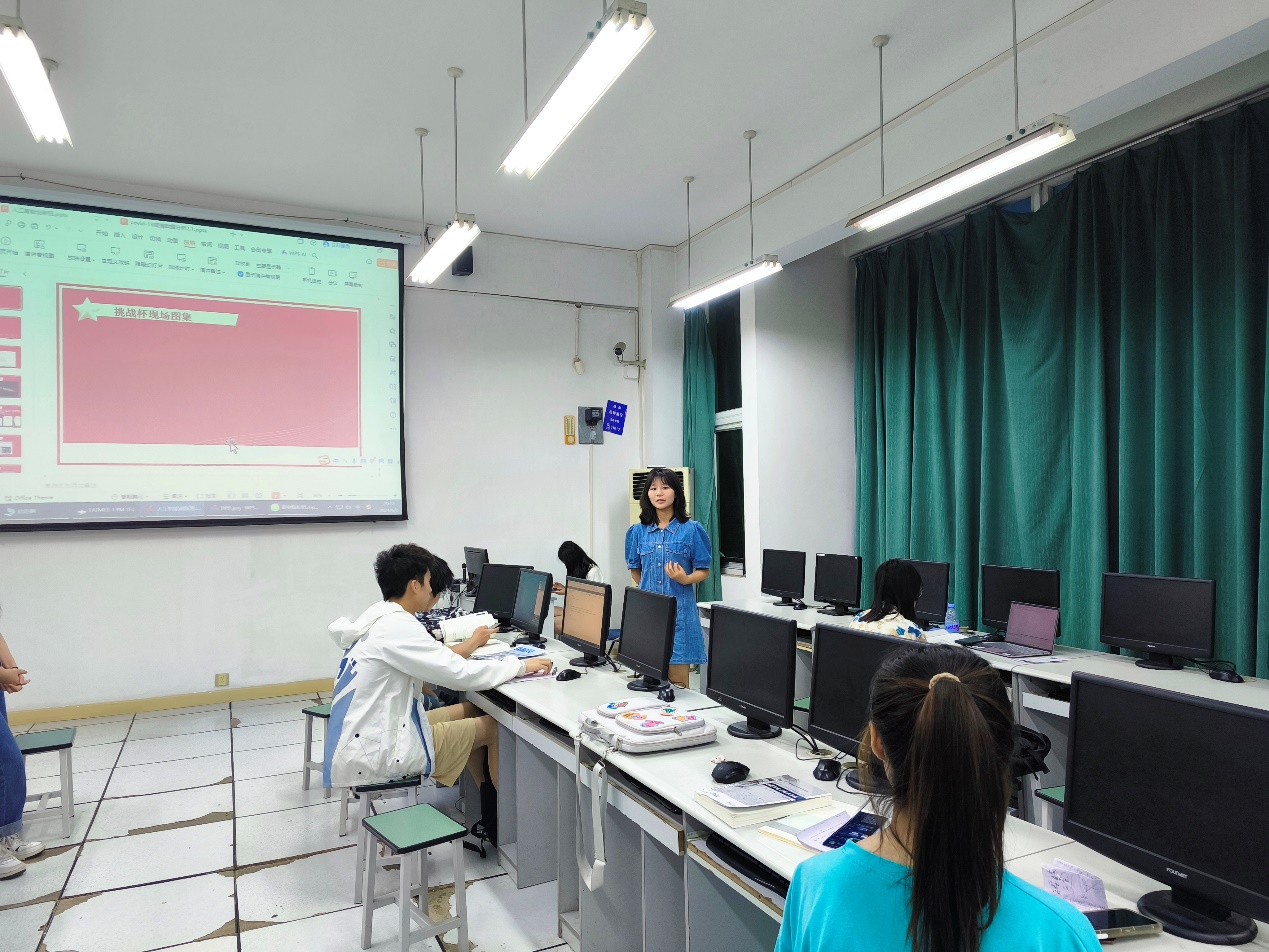 接着,22级数媒02班的刘亚美和包嘉怡分享了她们的参赛经历,包括队伍组建、赛前准备、作品研发等各个阶段。她们讲述了在“挑战杯”比赛过程中遇到的挑战和困难,以及如何克服这些难题,最终取得优异成绩的心路历程。这些真实的故事不仅让创新班的同学们感受到了比赛的激烈和挑战,也让创新班的同学在后续比赛中有了更多的学习与借鉴。