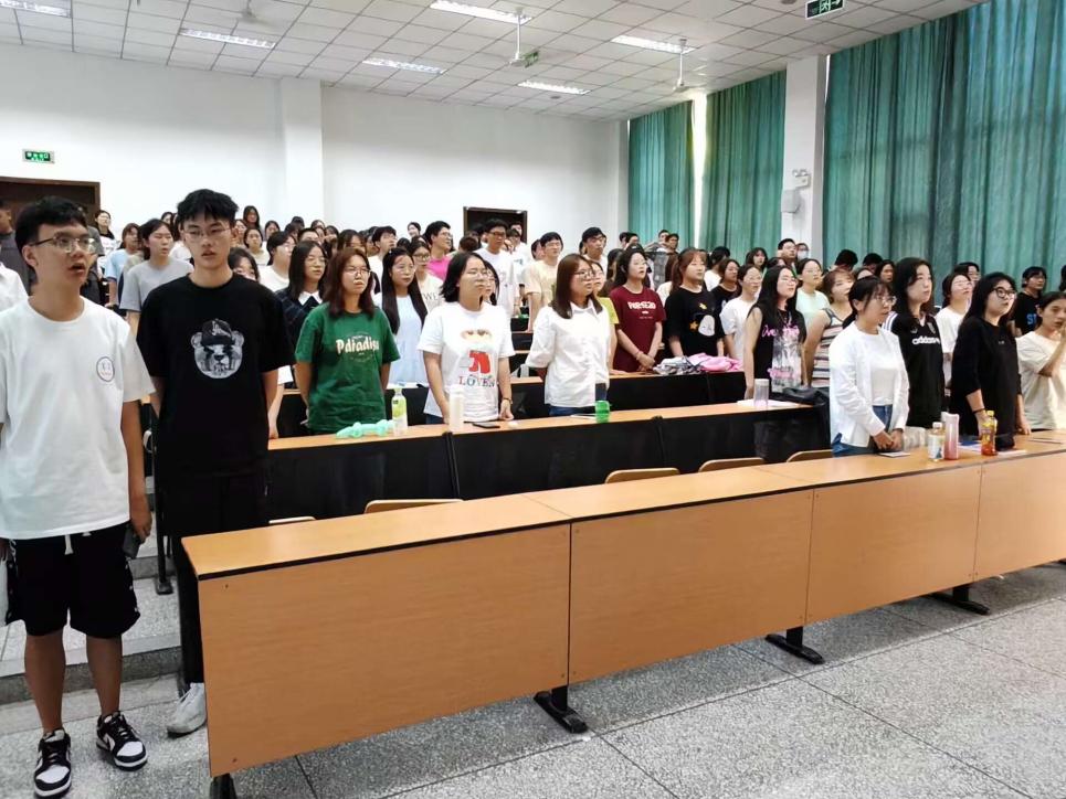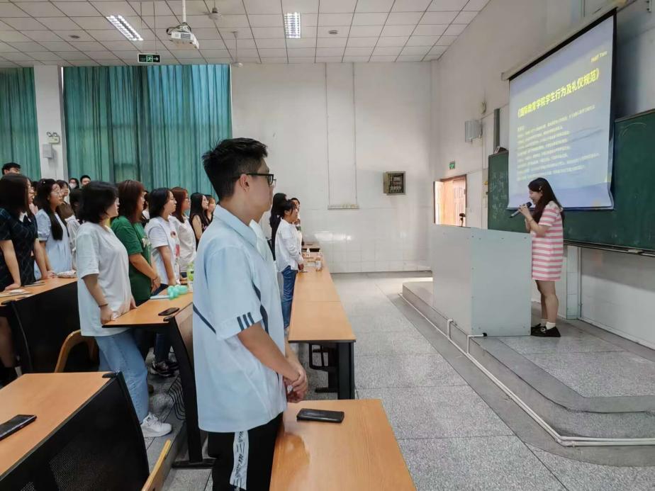 会议中,新生代表行为礼仪规范宣讲员付睿欣同学带领大家宣读《国际教育学院学生行为及礼仪规范》。在宣誓中,学院新生了解学院文明礼仪规范和要求,从礼仪、着装、上课等方面严格要求自己,争做文明国教人。