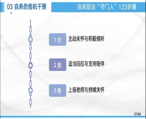 针对如何做好大学生心理健康的“守门员”,杨悦指出,我们既要积极进行生命教育,帮助同学们树立正确的人生观,提高生命质量,开发潜能实现自我价值,从上游预防自杀保护生命;又要耐心细心,一旦发现有心理健康问题的同学,要做他们的辩护者、倾听者,及时进行自杀干预和心理疏导。最后,她强调,好的“守门人”不只是被动地阻止自杀,也会主动积极的协助上报情况。