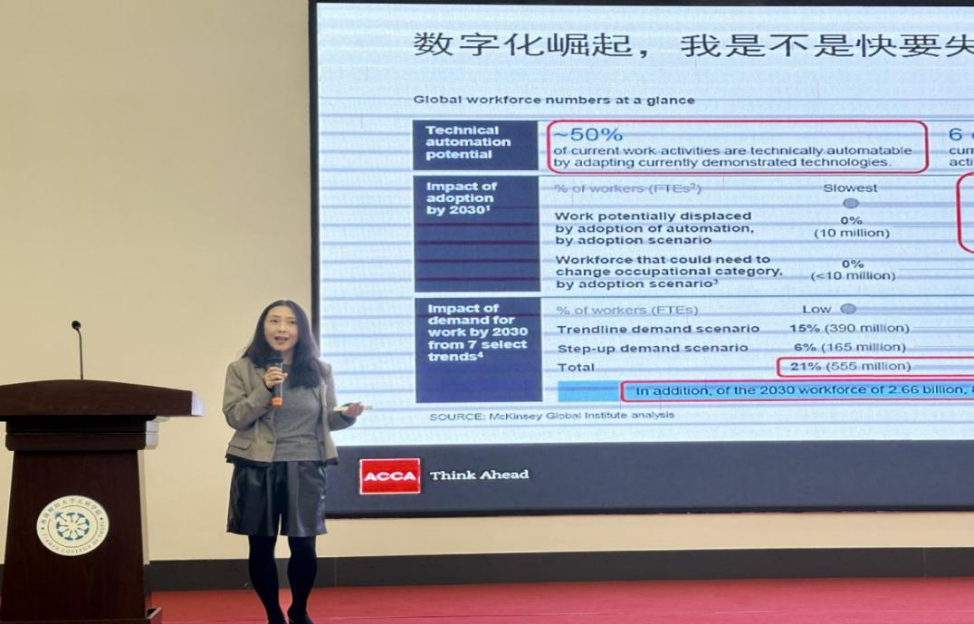 讲座中,王玮介绍了ACCA在未来职业发展中的优势,并指出数字化、全球化和创新化是财会行业的未来方向,学生需要具备扎实的基础知识技能以及适应变革的环境,才能在行业中取得优势;ACCA的专业性人才在职业发展过程中有相对更加广阔的职业前景以及较大的市场需求量。除此之外,王玮还向在场的学生们提出了专业课程的学习建议,并鼓励同学们积极尝试,勇于创新。
