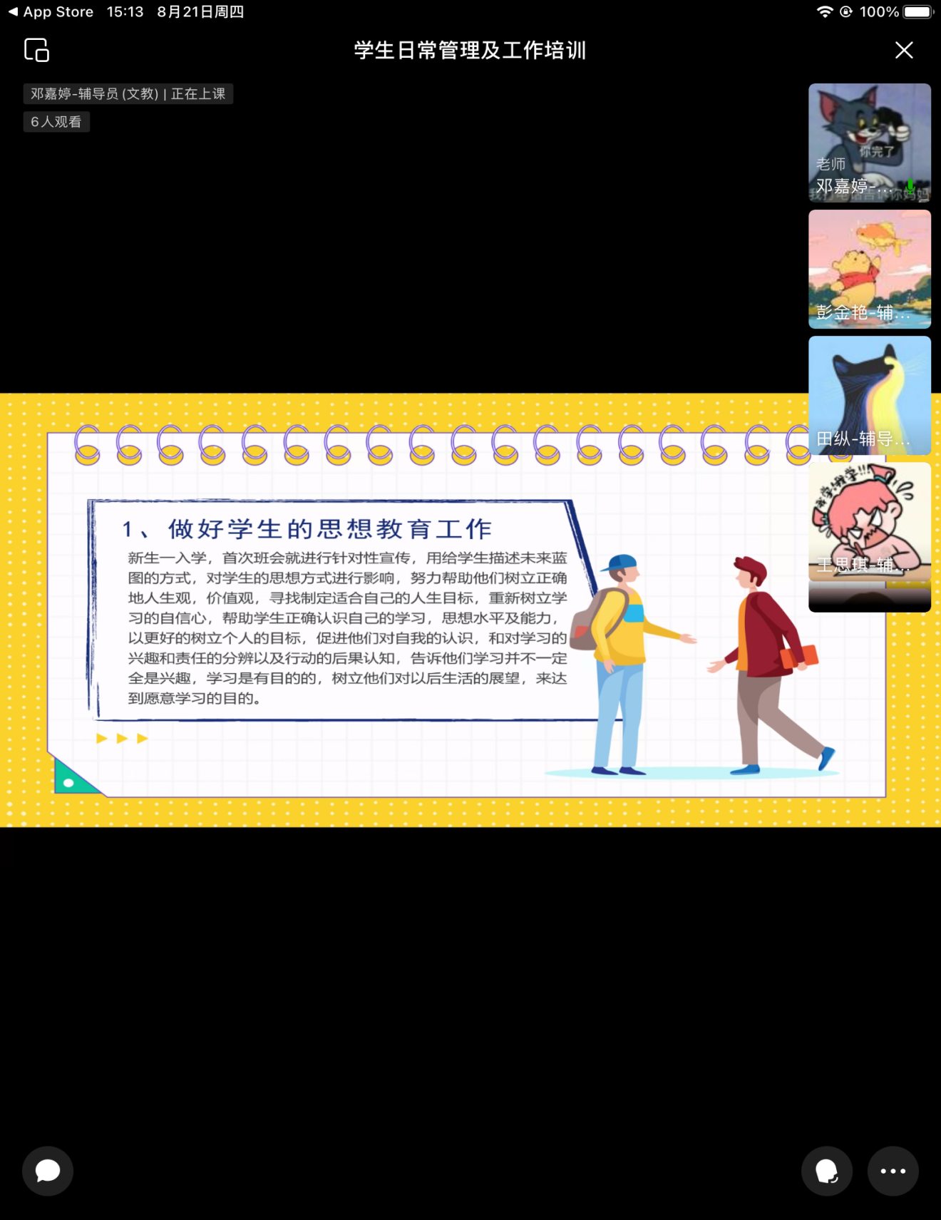 “学生日常管理工作”培训聚焦安全管理和班风学风建设。主讲人邓嘉婷结合工作经验,阐述了掌握学生动态信息的重要性和具体方法,并从新生教育、班委培养、深入谈心、考勤管理等方面提出了切实可行的建议。培训还特别关注学生心理健康工作,指导辅导员掌握初步识别与应对技巧,建立家校联动机制。