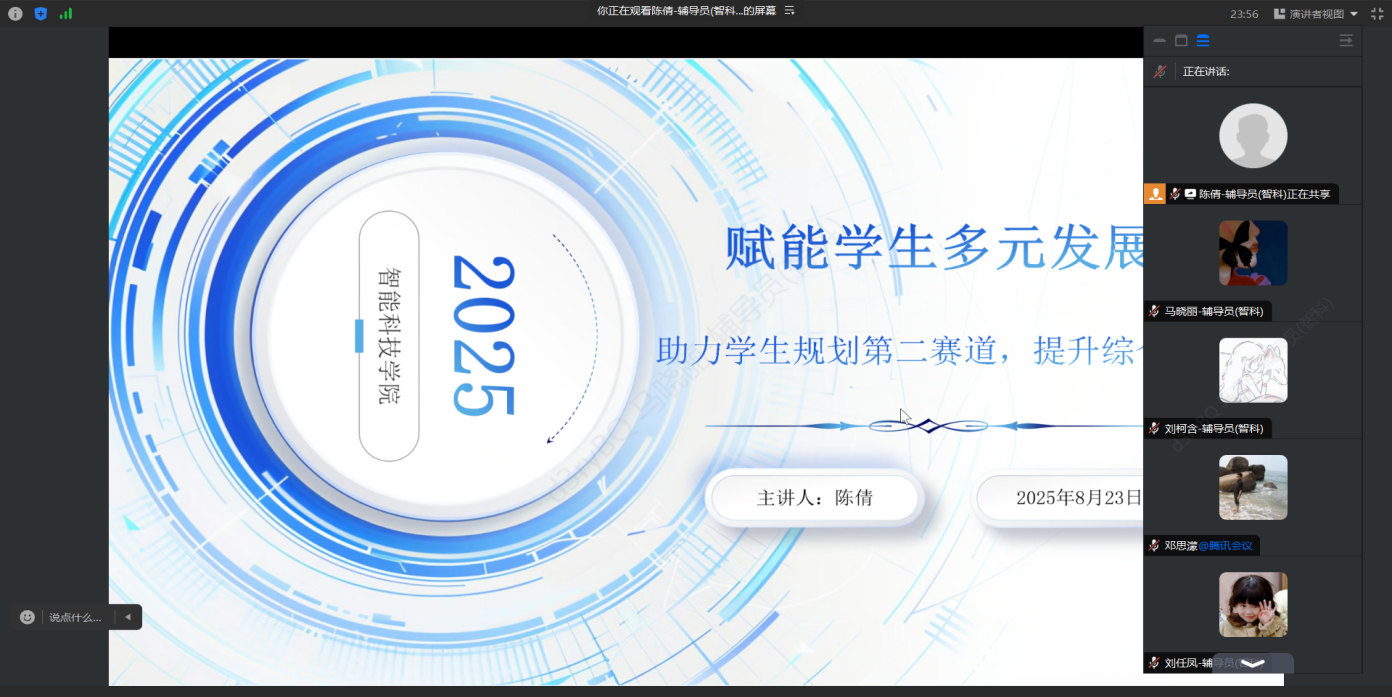 为主动适应人工智能教育改革趋势,进一步培养复合型人才、提升学生核心竞争力,8月23日,智能科技学院在线上开展第十三期辅导员职业能力训练营。本期训练营集中讨论第二学位与第二专业相关工作事宜,由综合办主任陈倩主持,学院分党委书记常荣、副书记李禹锌及全体辅导员参会。