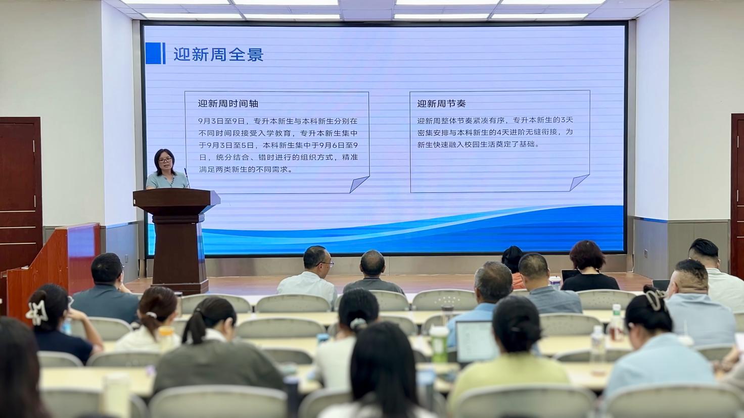 潘兰总结了迎新工作的阶段性成果,包括顺利完成新生家长会、新生入学教育、第二课堂讲解以及班委选举等重要活动。她特别提到,家长见面会的举办成功地让家庭和学校从“各自为战”走向了“协同作战”,而“书记、院长第一课”则通过学院领导亲身经历诠释了大学精神,帮助新生系好了大学生活的“第一粒扣子”。
