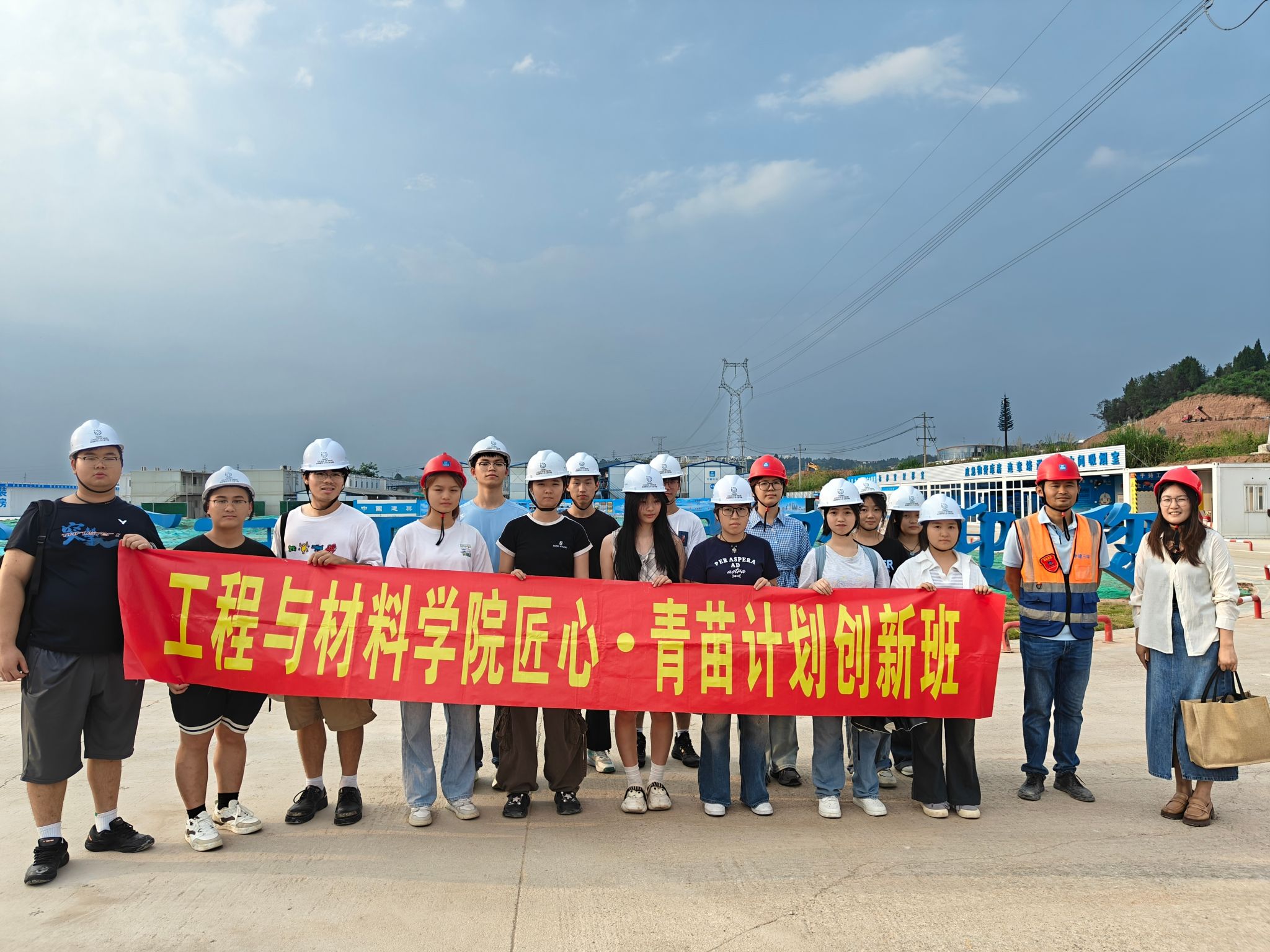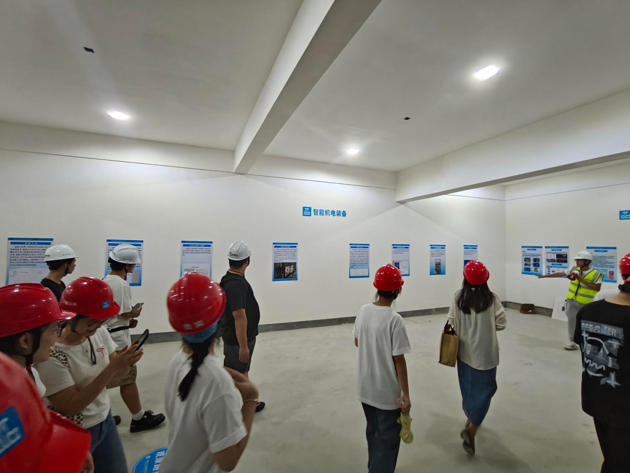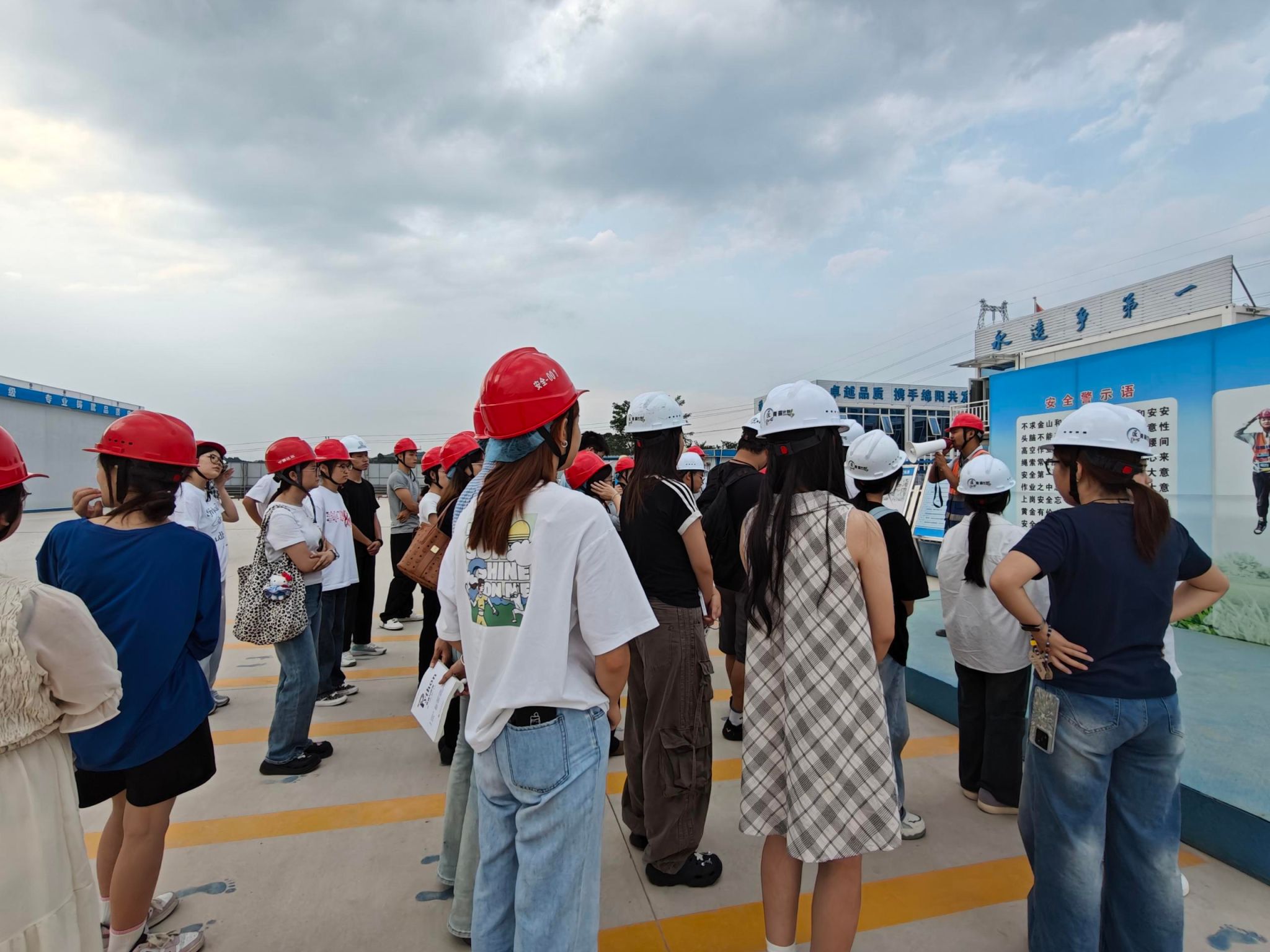 出发前,陈静强调了本次实践学习的安全要点,包括交通安全、设备操作规范、个人防护用品佩戴以及应急处置流程等。抵达项目后,项目安全总监首先为师生们讲解了施工现场安全须知,包括安全帽的正确佩戴方法和注意事项。在完成安全准备后,师生们在项目安全总监、项目工程师、陈静的引导下进入模范项目基地。