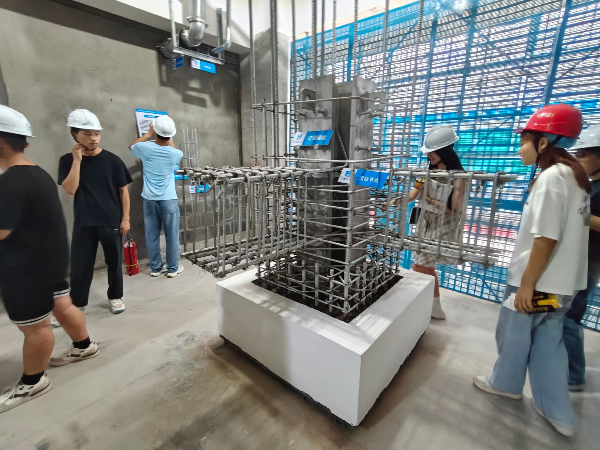 最后在施工现场的实体构件展示区,现场工程师及陈静介绍了装配式预制构件、现浇构件,包括梁、板、柱、楼梯等节点,也讲解了安装工程的强电设备、给排水管道、消防系统和室内部分装饰装修材料及工艺,他们的讲解让同学们脑海中抽象的理论转化为具体的实践认知。