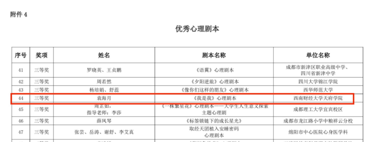近日,在四川省心理学会主办的2025年“个体咨询、团体辅导、心理活动优秀案例及优秀心理剧本”评选活动中,艺术与传媒学院辅导员袁锦涛、袁海月表现突出,荣获佳绩。本次活动共收到全省各单位提交的申报表550余份。艺术与传媒学院两位辅导员凭借扎实的专业素养和富有成效的心理健康实践成果,在评选中脱颖而出,展现了学院在心理健康教育方面的积极探索与实践水平。此次获奖,是学院持续关注师生心理健康、结合实际需求深入开展心理健康教育工作的具体体现,也充分反映了学院在该领域取得的丰硕成果。