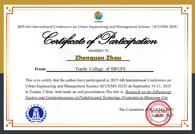 近日,2025年第六届城市工程与管理科学国际会议(ICUEMS 2025)在中国天津召开。本次国际学术会议由天津财经大学主办,旨在为从事城市工程、管理科学相关领域的专家、学者、工程师和技术研究人员提供一个平台,分享科研成果和前沿技术。学校工程与材料学院低空经济系主任周桢佺受邀参会并就主持的2025年度“校地共建”专项项目《绵阳市装配式技术推广的影响因素及对策研究》在本次学术会议展开交流,受到了与会专家和业内学者的高度肯定。