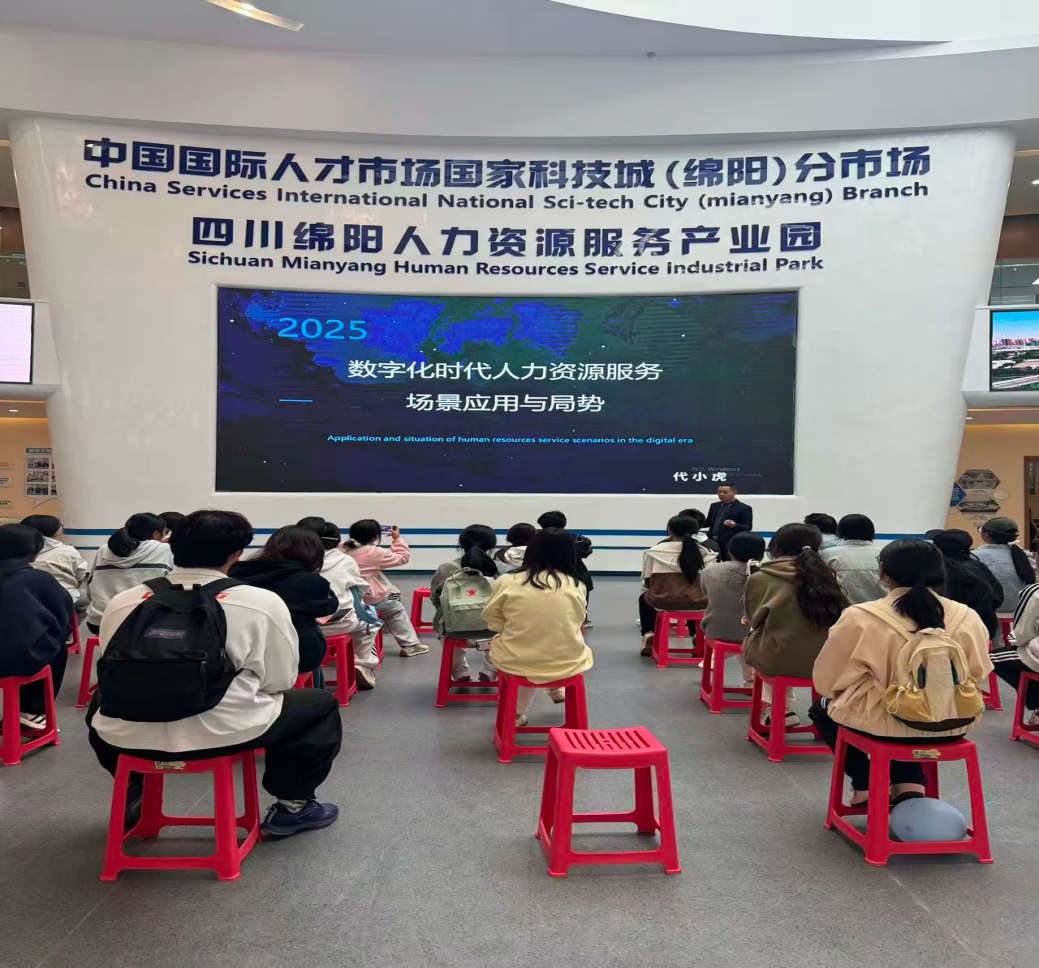 15日,学生们首先在产业园工作人员的介绍下,参观了科技城人力资源服务产业园,了解了入驻人力资源企业的业务情况,四川风帆企业代小虎经理为学生做了一堂主题为“数字化时代人力资源服务场景应用与局势”的现场讲座,学生了解了现代人力资源企业在人工智能和数字化发展的驱动下所进行的业务开展情况。代小虎为学生们展示了企业正在执行的人力资源系统,并对未来人力资源发展新趋势为学生们做了行业分析。16日,学生们到涪城区人力资源智慧招聘大厅进行了交流学习,并现场体验了智慧招聘的信息录入及人才政策查找系统,对整个人力资源行业和企业人力资源管理的区别有了深入的认知。