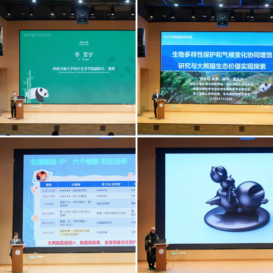 主旨演讲环节如期举行,由西南交通大学设计艺术学院副院长、教授李芳宇担任学术主持,三位专家围绕熊猫生态价值、智能创生与数字创意展开分享。浙江大学环境与资源学院教授邓劲松以《生物多样性保护和气候变化协同增效研究与大熊猫生态价值实现探索》为题,结合研究实践,阐述了大熊猫国家公园生物多样性保护与生态价值转化的路径;北京大学深圳研究生院教授邹月娴在《当AIGC遇见大熊猫:打造中国超级IP的智能创生链》中,探讨人工智能技术与熊猫IP融合创新的实现机制;成都大学中国-东盟艺术学院美术与设计学院名誉院长许燎源以《数字工具的想象力边界》为主题,从创意设计视角阐释数字技术对熊猫文创表达维度的拓展。