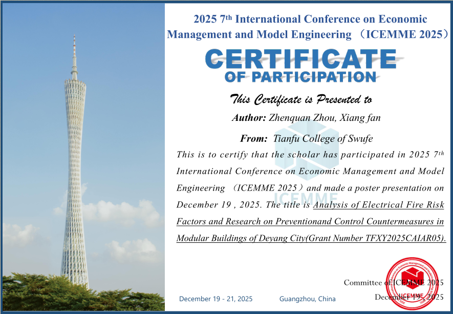 近日,2025年第七届国际科技创新学术交流大会暨经济管理与模型工程国际学术会议(ICEMME 2025)于12月19至12月21日在中国广州召开。本次国际学术会议由IEEE PES智慧楼宇及负载和客户支持系统卫星技术委员会(中国)等多家知名业界单位联合主办,旨在为来自国内外高等院校、科学研究所、企事业单位的专家、教授、学者、工程师等提供一个分享专业经验及展示研究成果的国际平台。工程与材料学院低空经济系主任周桢佺受邀参会并就主持的2025年304永利集团官网入口建筑智能化应用研究中心校级专项课题项目《德阳市模块化建筑的电气火灾风险因素分析及防控对策研究》相关研究内容在本次学术会议进行了学术交流及海报展示,受到了业内学者和专家的高度肯定。