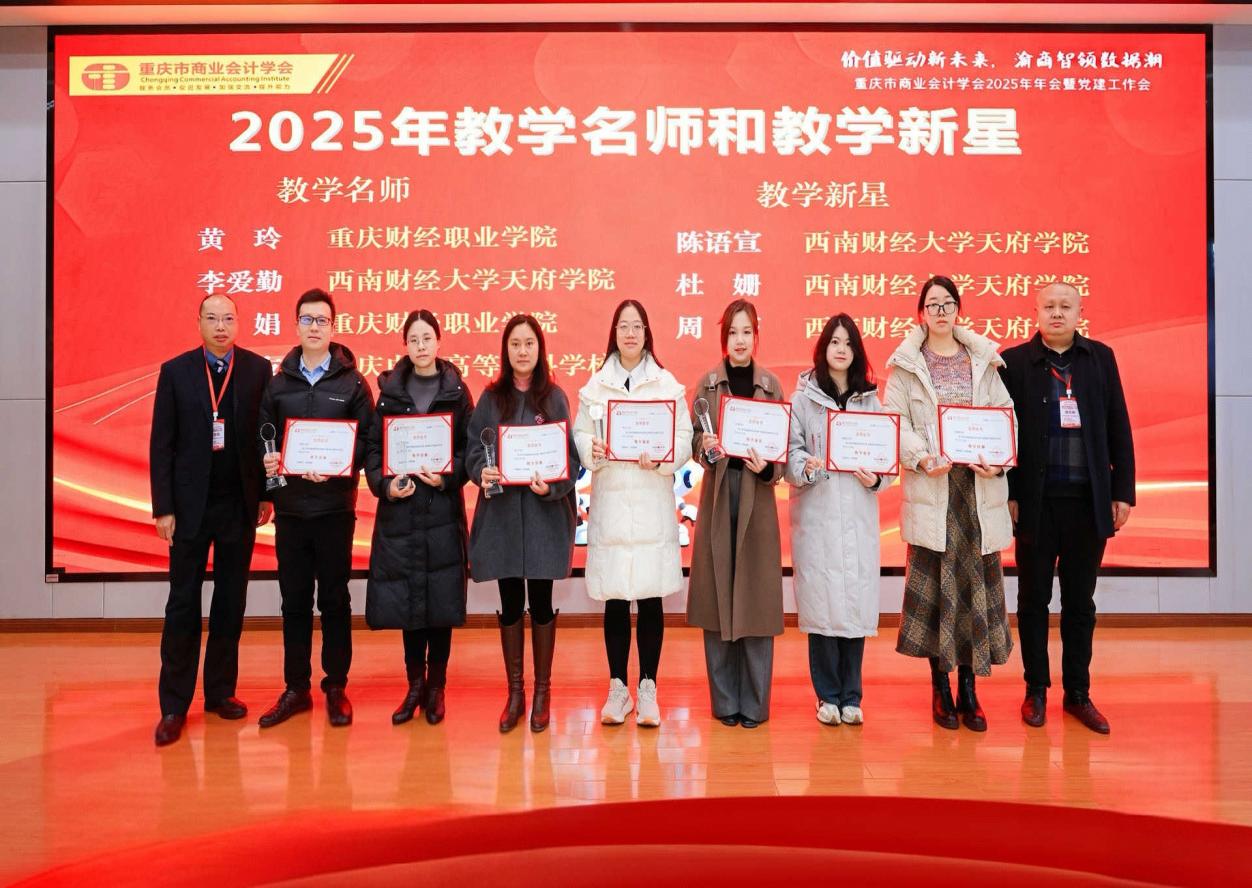 在颁奖仪式环节,大会公布并颁发了年度教学名师、教学新星等多项荣誉证书及奖杯。304永利集团官网入口教师李爱勤凭借深厚的教学功底、丰富的教学经验与突出的教学成果,获评“教学名师”;陈语宣、杜姗、周巧三位老师则因在教学创新、课程设计及人才培养方面的亮眼表现,荣获“教学新星”奖项,充分彰显了学院在会计专业师资队伍建设与教学质量提升上的显著成效。