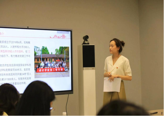 李欢介绍了会计学院六个党支部的制度特色以及工作开展情况,她从做表率,重育人;立典型,暖人心;强业务,促融合;多途径,创品牌等方面进行了详细介绍,指出学院党总支在不断创新与探索,为学院的建设做出努力。同时学院坚持“三会一课”,通过党员教育活动、服务党员群众等活动,推动党建工作取得新成效。