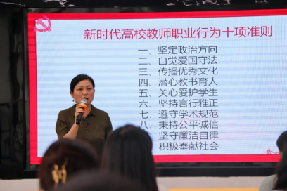 陈真子首先领读了《新时代高校教师职业行为十项准则》:“坚定政治方向、自觉爱国守法、传播优秀文化、潜心教书育人、关心爱护学生、坚持言行雅正、秉持公平诚信、遵守学术规范、坚守廉洁自律、积极奉献社会”,并表达了对新进教职工的期许,望大家牢记“身正为师,德高为范”的主旨,为祖国培养更多优秀人才。