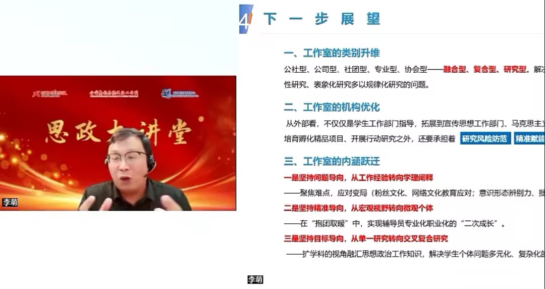 会议伊始,李萌从高校辅导员工作室的“五种常见形态”入手,详细介绍了公社型工作室、公司型工作室、社团型工作室、专业型工作室和协会型工作室的不同形态。李萌分享了他在辅导员工作室建设方面的见解。他指出,当前辅导员工作室建设面临着一系列现实瓶颈,如形式大于内容、核心难以整合和资源难以共享等,为了解决这些问题,必须从结构调整入手,明确辅导员的角色定位,整体提升队伍专业化。针对工作室的未来发展方向,李萌从辅导员工作室类别升维,机构优化和内涵跃迁三个维度进行了分享。