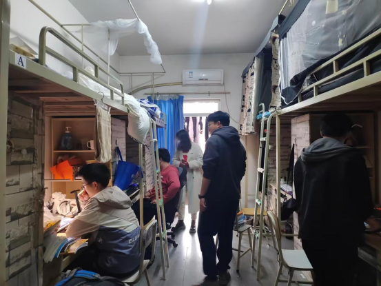在常荣、李禹锌、陈倩及刘丹的带领下,综合办全体教师分组前往学生寝室和教学楼开展查寝查课工作。在查寝过程中,教师们认真检查了寝室卫生、安全用电、有无旷课、学生在寝状态等方面的情况,并与同学们进行了亲切的交流,了解他们的生活和学习情况,鼓励他们养成良好的生活习惯和学习习惯。在查课环节,教师们深入课堂,观察学生的出勤情况和听课状态,对发现的问题及时进行了记录和反馈。